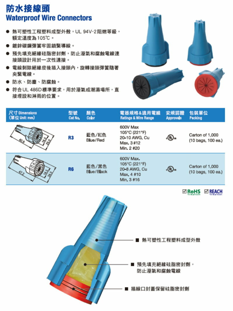 ‧ 彈簧式接線頭,預先填充絕緣矽膠密封劑。