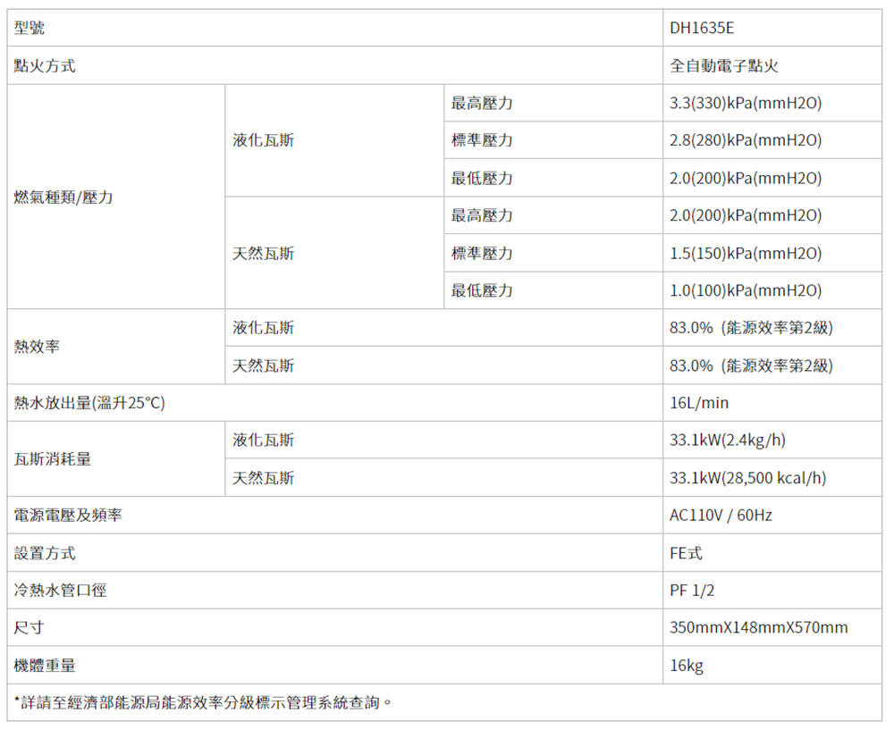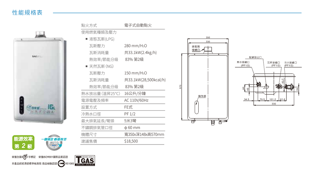 瓦斯消耗量:液化瓦斯 33.1kW(2.4kg/h) / 天然瓦斯 33.1kW(28,500 kcal/h)