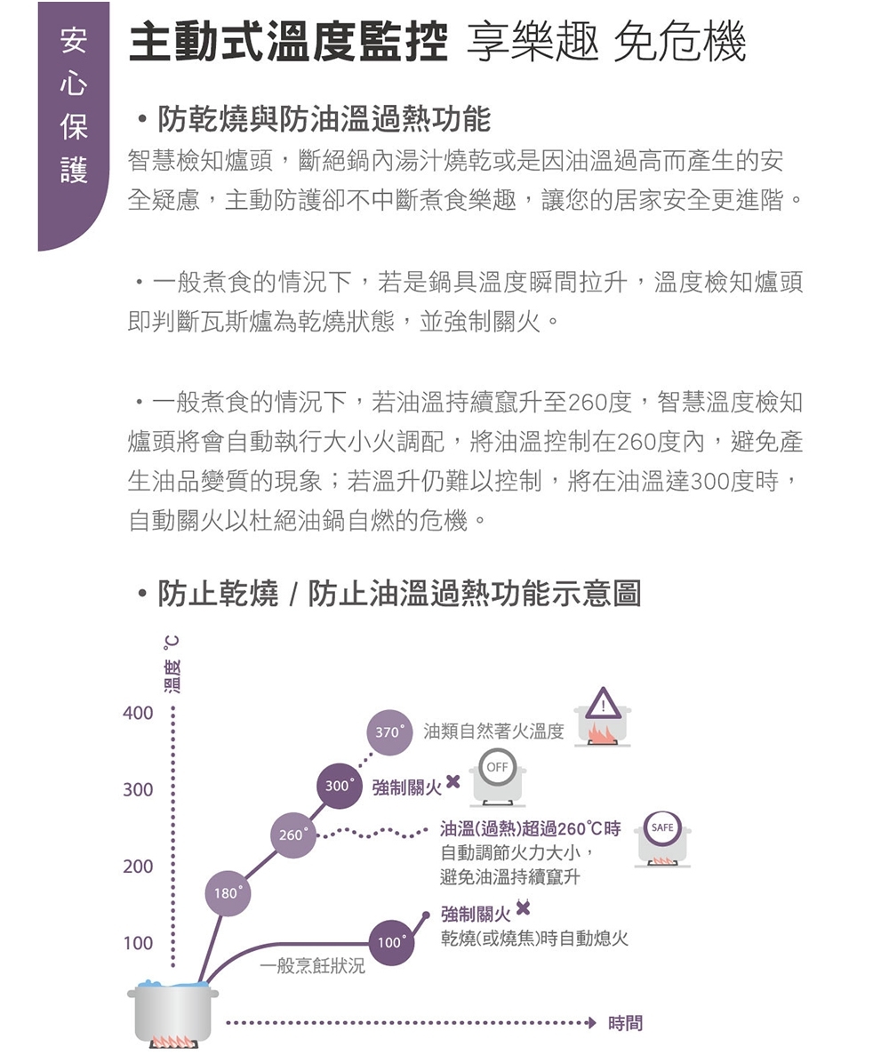 ▪ 智能乾燒檢知與過溫保護裝置,避免廚房危機