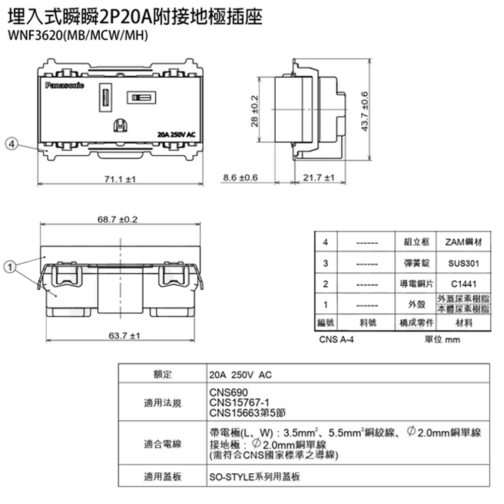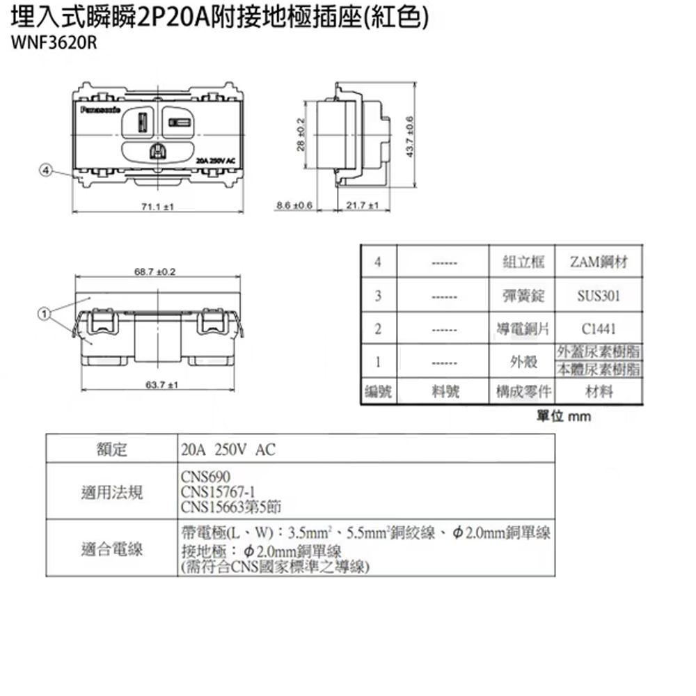 ‧融入空間:讓配線器具自然融於空間之中的設計理念額定:插座20A 250V AC