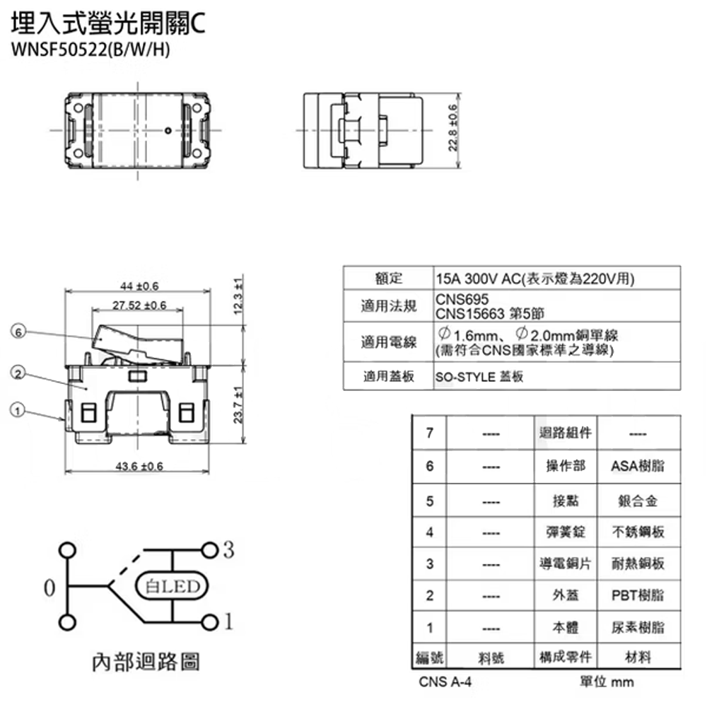 額定:開關 15A 300V AC