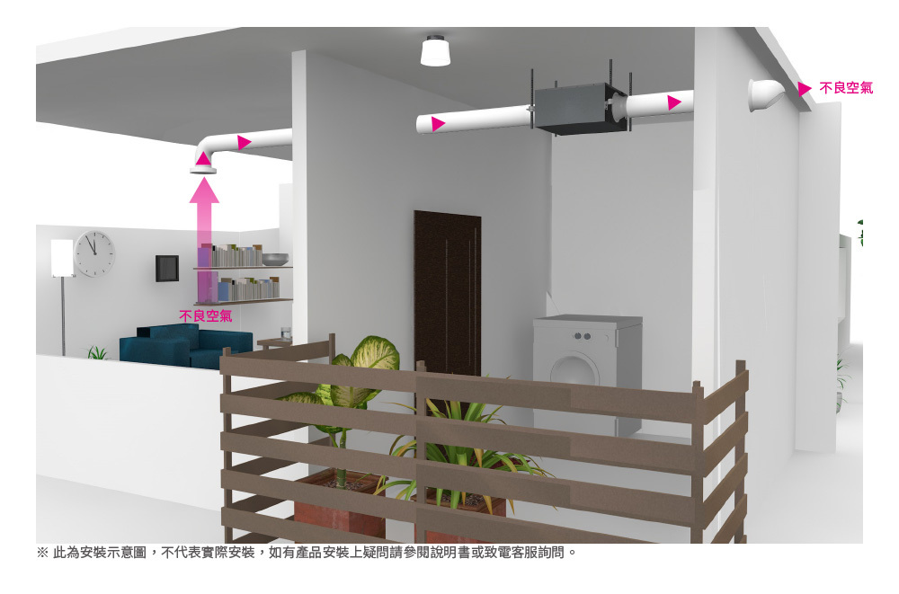 ▪ 可搭配全室淨化新風機 (正壓進氣管道扇),一進一出達成平衡換氣的新風活氧系統