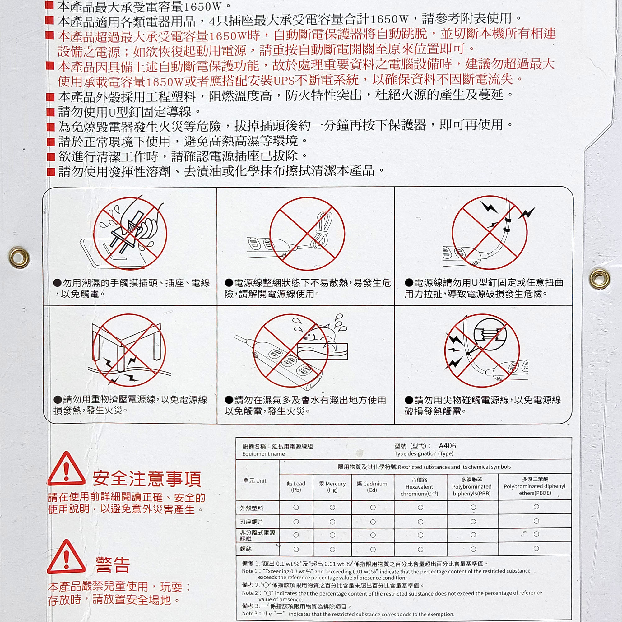 額定規格: AC125V / 15A / 1650W MAX